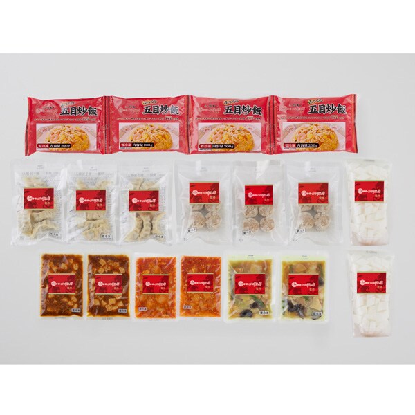 - 乾焼蝦仁(エビチリソース)150g、四川麻婆豆腐150g、ふっくら五目炒飯(200g×2)、杏仁豆腐500g、本格八宝菜150g×各2、貝柱入焼売120g(4個入)、餃子120g(6個入)×各3