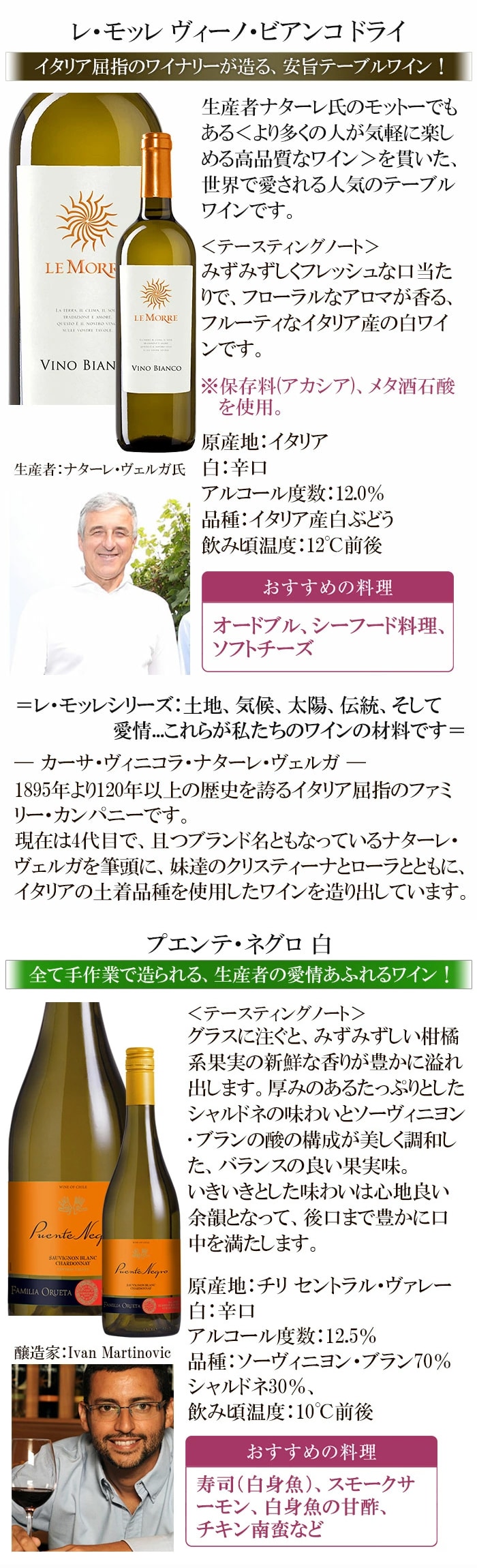・レ・モッレ ヴィーノ・ビアンコ ドライは、保存料(アカシア)、メタ酒石酸を使用。