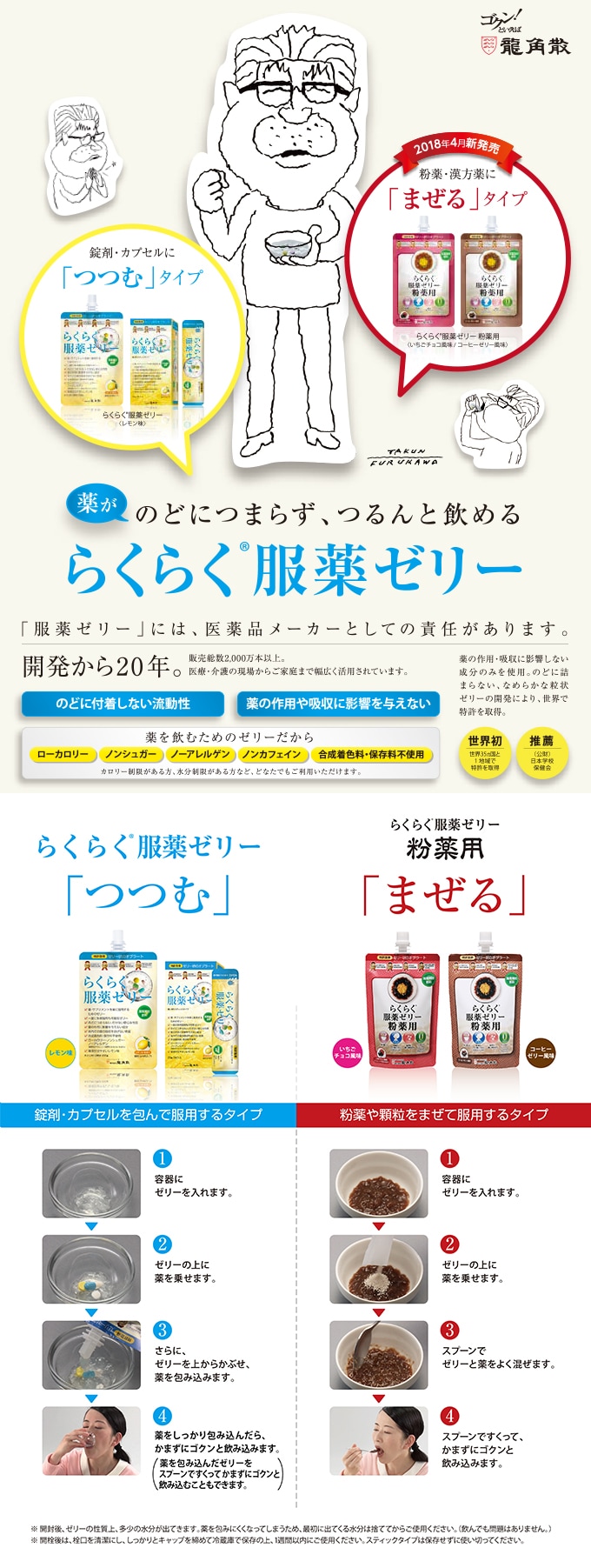 4月に発売された"らくらく服薬ゼリー粉薬用“は、「粉薬が口に残る」「飲むときにむせてしまう」「飲みにくい」といった生活者の声に応え、ゼリーに粉薬や顆粒を混ぜて服用できるように開発した製品です。粉薬をゼリーと混ぜることで、粉薬がまとまり、口の中に広がらず、むせずにつるんと服用することができます。