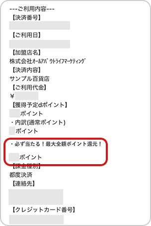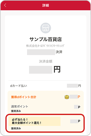 期間中、サンプル百貨店(公式サイト)とd払い|サンプル百貨店(d払い モバイルオーダー)(d払い店)にて、「d払い」で商品をお申込みいただいたお客さまに対し、200円(税込)につき1ポイントに加えて、抽選により最大でご利用金額全額分を還元します。