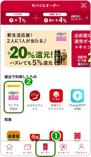 サンプル百貨店が、d払いアプリのモバイルオーダーから、お得にご利用いただけます。