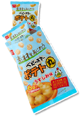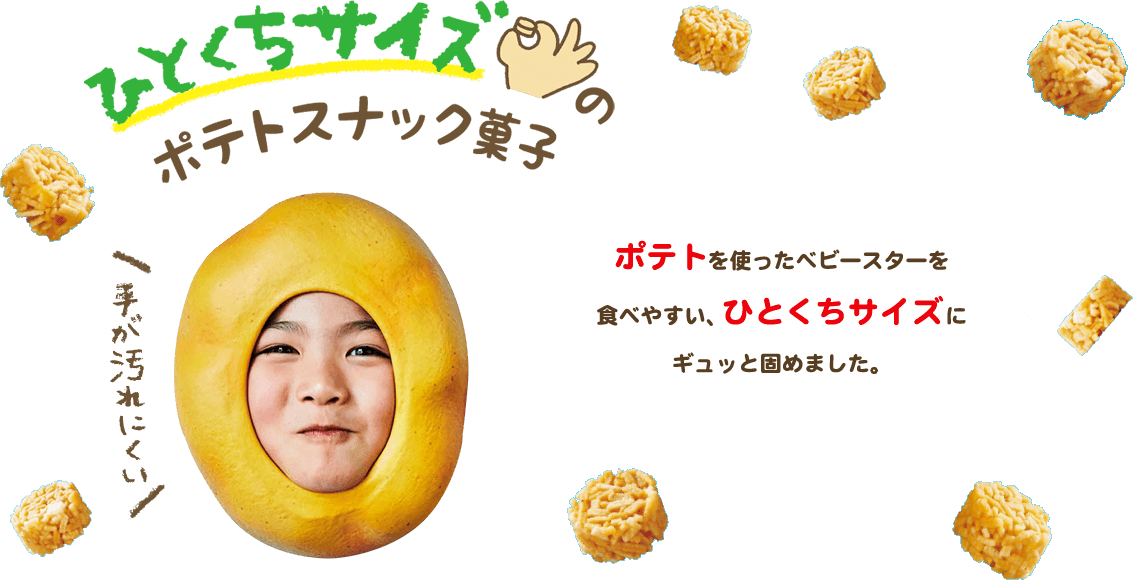 ポテトを使ったベビースターを食べやすい、ひとくちサイズにギュッと固めました。