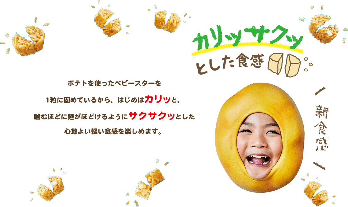 ポテトを使ったベビースターを1粒に固めているから、はじめはカリッと、噛むほどに麺がほどけるようにサクサクッとした心地よい軽い食感を楽しめます。