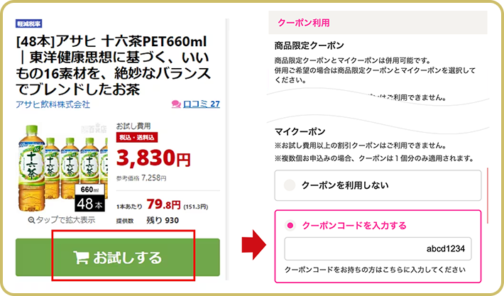 - ・内容確認ページの「クーポン」の欄で「クーポンコードを入力する」を選択し、このページの上部のクーポンコードを入力する。クーポン適用後、お支払い金額が割引されたことを確認し、確定ボタンを押してください。