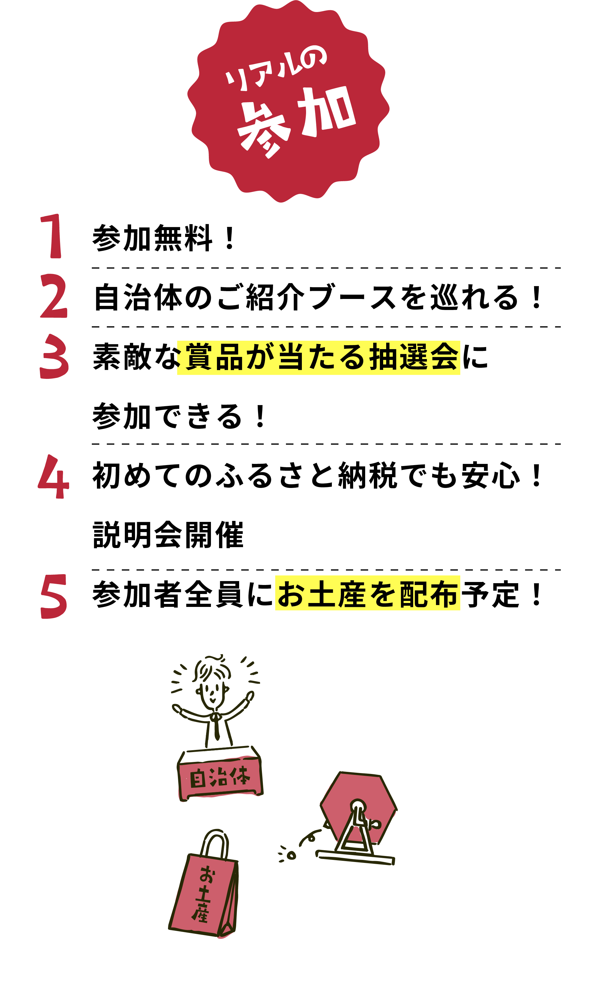 当イベントでは自治体や事業者が直接皆さまに地域の特産物や魅力についてご紹介!また、ふるさと納税についての講演も実施予定!地域の魅力に出会える機会を提供いたします。