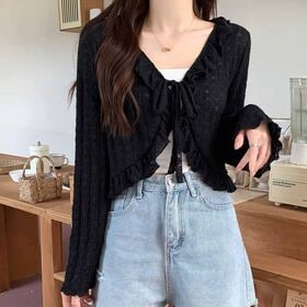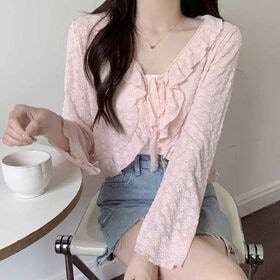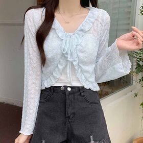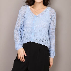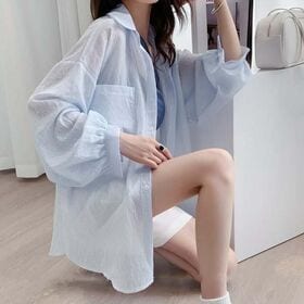 【ライトブルー】シャツカーディガン 透け感ボーダー