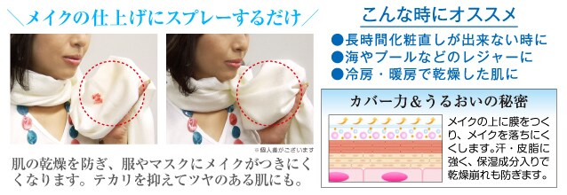 ご使用方法 : メイク後、お肌から20cmほど離して、目を閉じて顔全体にスプレーした後、お肌になじませて乾かしてください。