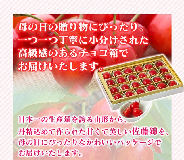 - 【母の日ギフト】山形県産ハウスさくらんぼ(佐藤錦)チョコ箱詰めM玉・24粒入り