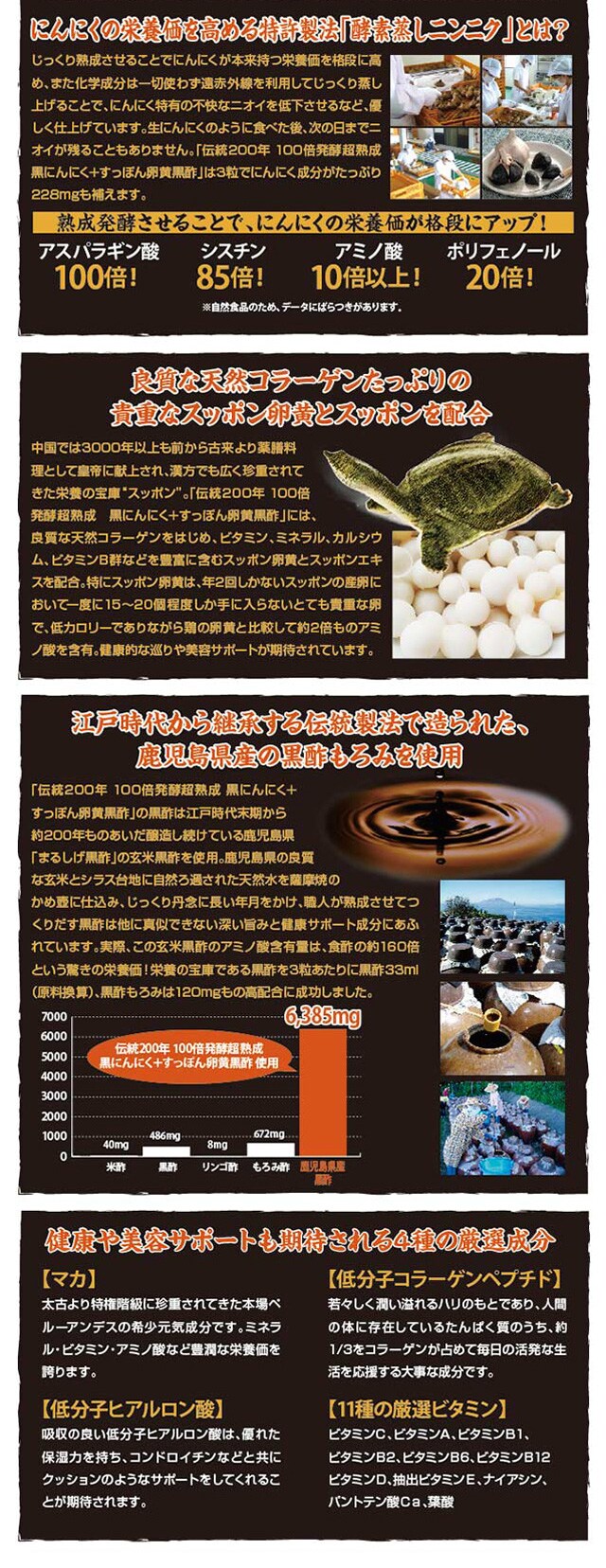 原材料 : 黒ニンニク粉末、黒酢もろみ末、黒酢粉末(米黒酢粉末、玄米抽出粉末)、スッポン末、スッポン卵黄末、マカエキス末(マカ、デキストリン)、コラーゲンペプチド(魚由来)、食用油脂、ゼラチン、グリセリン、ミツロウ、グリセリン脂肪酸エステル、ヒアルロン酸、植物レシチン(大豆由来)、V.C、抽出V.E、ナイアシン、パントテン酸Ca、V.B1、V.B6、V.B2、V.A、葉酸、V.D、V.B12