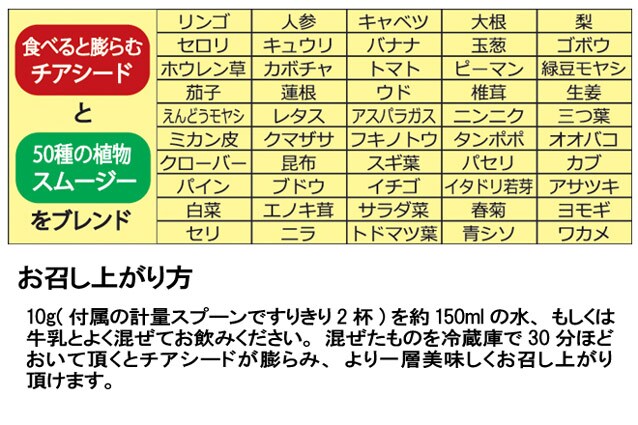 原材料 : チアシード、大麦若葉粉末、砂糖、ブドウ糖、バナナ粉末(デキストリン、果糖、バナナピューレ)、りんご粉末(デキストリン、りんご濃縮果汁)、植物発酵エキス粉末(小麦粉、砂糖、食塩、リンゴ、人参、キャベツ、大根、梨、セロリ、キュウリ、バナナ、玉葱、ゴボウ、ホウレン草、カボチャ、トマト、ピーマン、緑豆モヤシ、茄子、蓮根、ウド、椎茸、生姜、えんどうモヤシ、レタス、アスパラガス、ニンニク、三つ葉、ミカン皮、クマザサ、フキノトウ、タンポポ、オオバコ、クローバー、昆布、スギ葉、パセリ、カブ、パイン、ブドウ、イチゴ、イタドリ若芽、アサツキ、白菜、エノキ茸、サラダ菜、春菊、ヨモギ、セリ、ニラ、トドマツ葉、青シソ、ワカメ)、増粘剤(加工澱粉、増粘多糖類)、甘味料(アセスルファムK)、香料、(原材料の一部に小麦、りんご、バナナを含む)