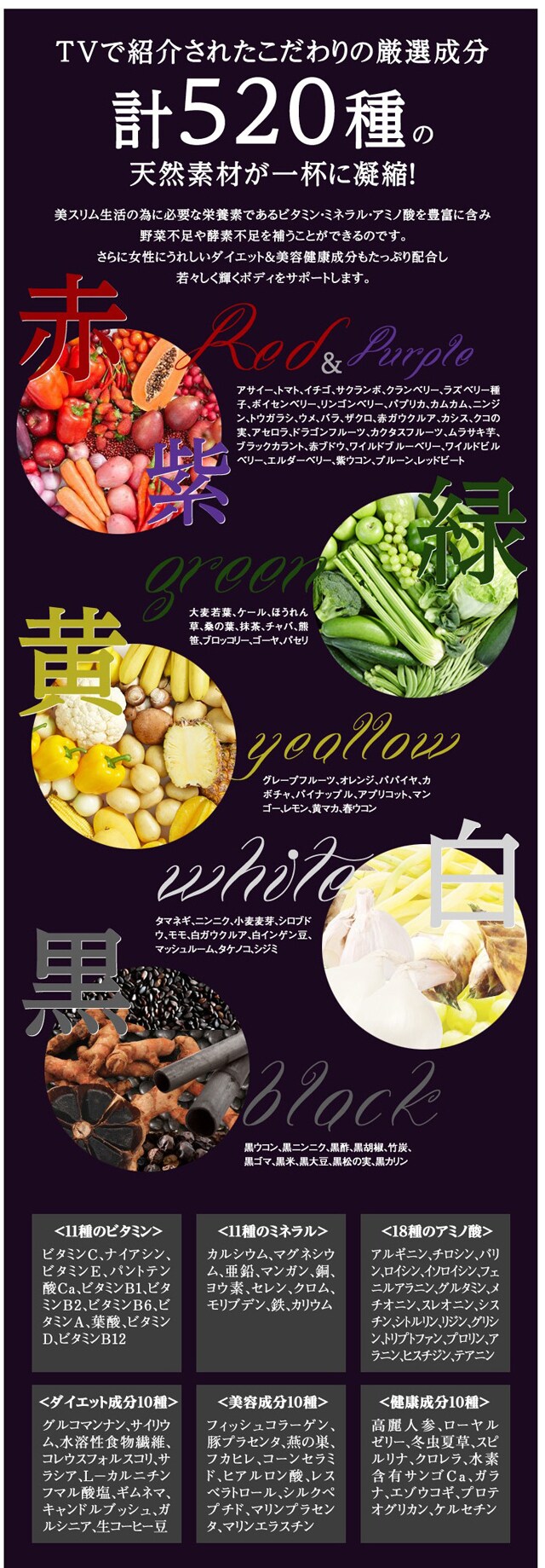 原材料 : 水溶性食物繊維、アヤムラサキ末、植物発酵エキス末(黒糖、葉菜類、果実類、根菜類、イモ類、野草類、キノコ類、海藻類、など)、複合ハーブエキス末(アーティーチョーク、アイブライト、アグリモニーなど)、抹茶末、熊笹末、マンゴー果汁末、レモン果汁末、黄マカ末、春ウコン末、アサイーFDパウダー、ボイセンベリーエキス末、リンゴンベリーエキス末、パプリカ末、カムカム果汁末、梅肉末、バラ花びら抽出物、ザクロエキス末、ソフォンエキス末、カシスエキス末、クコの実エキス末、アセロラエキス末、ドラゴンフルーツエキス末、ウチワサボテン果汁末、紫ウコン末、プルーン末、レッドビート末、モモ果汁末、プエラリアミリフィカ末、白インゲンエキス末、マッシュルームエキス末、タケノコ繊維末、シジミ末、黒生姜末、発酵黒ニンニクエキス末、黒酢末、黒胡椒末、L-シトルリン、フィッシュコラーゲンペプチド、豚プラセンタエキス末、燕の巣末、フカヒレ抽出物、コーンセラミドエキス末、赤ワイン抽出物、シルクペプチド、鮭卵巣膜抽出物、マリンエラスチンエキス末、高麗人参末、ローヤルゼリーFD末、冬虫夏草末、スピルリナ、クロレラ、水素吸蔵サンゴ末、ガラナエキス末、エゾウコギエキス末、タマネギ外皮エキス末、グルコマンナン、サイリウムハスク末、コレウスフォルスコリエキス末、サラシアエキス末、L-カルニチンフマル酸塩、ギムネマ末、キャンドルブッシュ末、ガルシニア末、生コーヒー豆エキス末、フルーツ・野菜エキス(ぶどう、トマト、ニンジン、その他)、ベリー混合エキス末(ワイルドブルーベリー、ストロベリー、クランベリー、ワイルドビルベリー、エルダーベリー、ラズベリー)、黒五粉末(黒ゴマ、黒米、黒大豆、黒松の実、黒カリン)、野菜混合末(大麦若葉、ケール、ブロッコリー、カボチャ、チンゲン菜、パセリ、その他)、パン酵母(亜鉛、マンガン、銅、ヨウ素、セレン、クロム、モリブデン含有)、ブドウ糖、増粘剤、酸味料、甘味料(アスパルテーム・L-フェニルアラニン化合物)、香料、着色料(竹炭)、L-アルギニン、L-チロシン、L-バリン、L-ロイシン、L-イソロイシン、L-フェニルアラニン、L-グルタミン、L-メチオニン、L-スレオニン、L-シスチン、L-リジン、グリシン、L-トリプトファン、L-プロリン、DL-アラニン、L-ヒスジン、L-テアニン、貝Ca、酸化Mg、ピロリン酸第二鉄、塩化カリウム、V.C、V.E、ナイアシン、パントテン酸、V.B1、V.B6、V.B2、V.A、葉酸、V.D、VB12、(アレルギー物質:小麦、オレンジ、りんご、もも、バナナ、大豆含む)