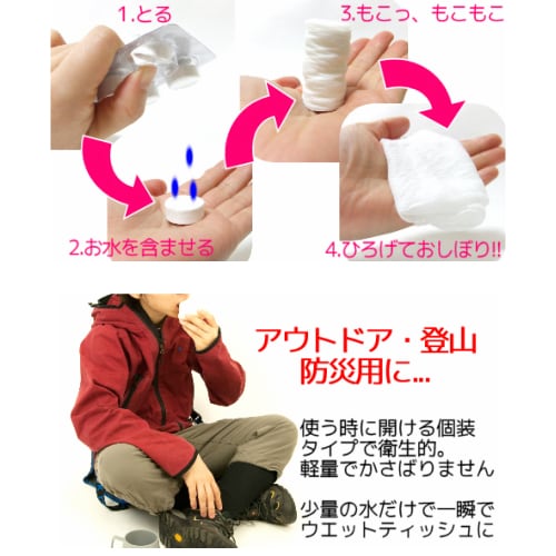 いざという時のために、防災用品の準備としてもおすすめです。少量の水をかければおしぼりやお手拭きになる携帯用おしぼりです。