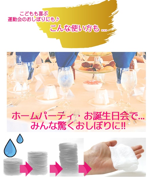 お水を少し含ませると、モコモコモコっとに膨らんで、おしぼりに変身しちゃうんです!
