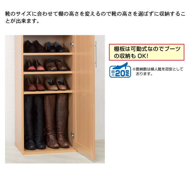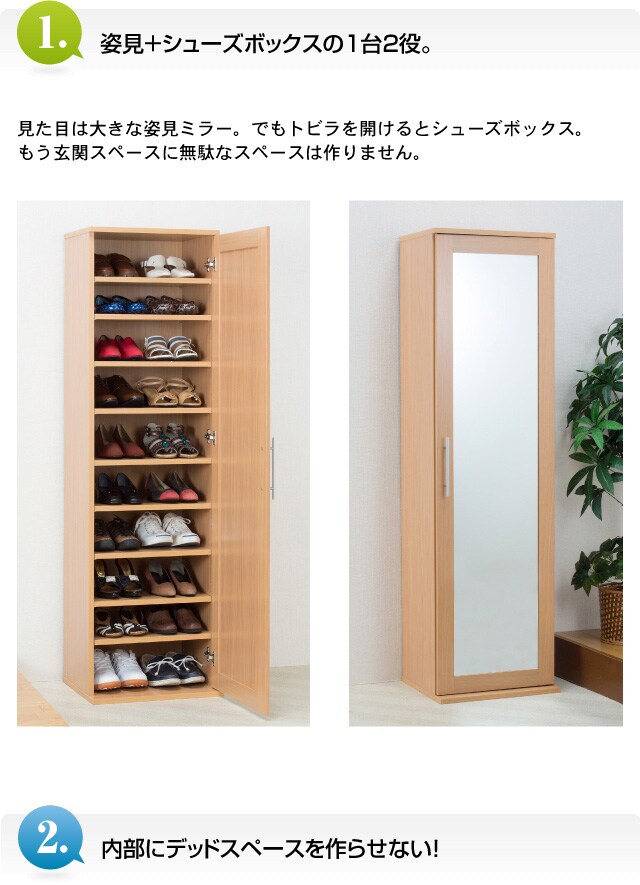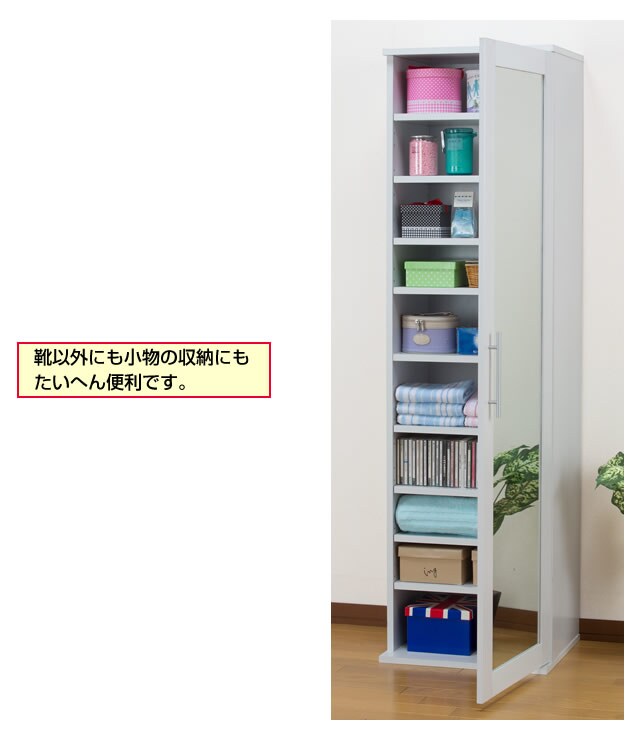 扉を閉めれば姿見として、開けばシューズボックスへと変身。ミラーは全身が映る余裕のサイズです。棚板は可動式なのでブーツの収納もOK!