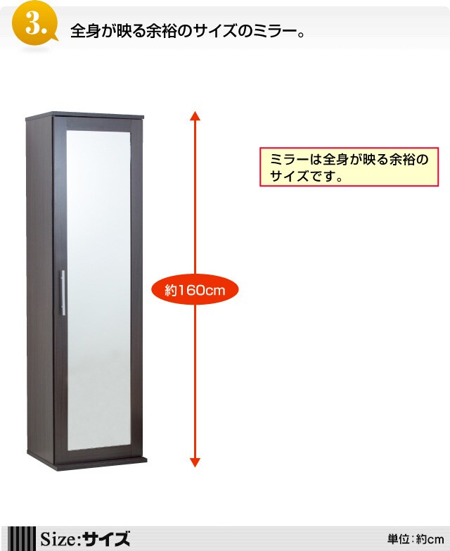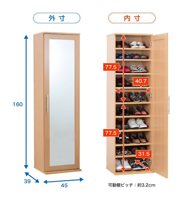 サイズ:約幅45×奥行39×高さ160cm、内寸:約幅40.7×奥行31.5×高さ(上段)天板から固定棚まで77.5cm、(下段)固定棚から最下部まで77.5cm、可動棚ピッチ:約3.2cm