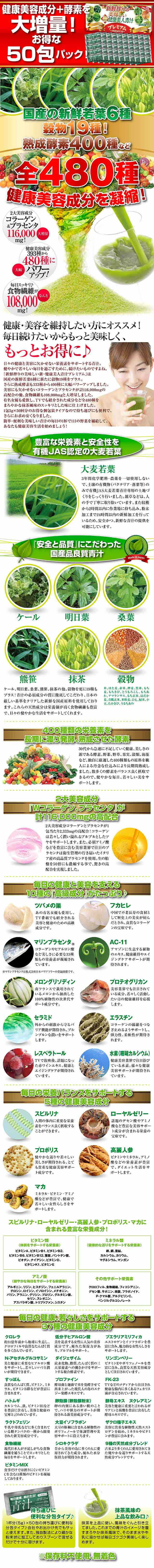 原材料 : ポリデキストロース、大麦若葉末、プラセンタエキス(豚由来)、抹茶、コラーゲンペプチド(ゼラチン、豚由来)、桑葉末、熊笹末、明日葉末、ケール末、クロレラ末、高麗人参末、ローヤルゼリー末、白キクラゲ抽出物、鮭卵巣膜抽出物、プロポリスエキス末、N-アセチルグルコサミン(エビ、カニ由来)、穀物発酵エキス末、ハトムギエキス、酒粕発酵物(酒粕発酵エキス・デキストリン)、酵母エキス(ポリアミン・ヌクレオチド含有酵母エキス、デキストリン)、植物発酵エキス末、カルシウム含有水素焼成サンゴ末、卵殻膜粉末、プエラリア・ミリフィカ末、スッポン末、大豆抽出物、リンゴンベリー(リンゴンベリー果汁、澱粉分解物)、ザクロ種子エキス末、赤ワインエキス末、19穀麹粉末(米、押麦、モチ玄米、はだか麦、黒米、もち麦、青肌玄米、米粒麦、もちきび、ひえ、とうもろこし、緑米、もちあわ、小豆、赤米、アマランサス、はと麦、たかきび、うるちあわ)、発酵コラーゲンペプチド(ゼラチン:豚由来、パイナップル果汁)、マカエキス末(マカ、デキストリン)、植物エキス(ケイケットウ、ベニバナ、キジツ、クチナシ、アサの実、ナツメ、ショウガ、カンゾウ、ハッカ)、スピルリナ、セラミド含有米抽出物、フカヒレ軟骨抽出物(コンドロイチン含有)、酵素処理燕窩、キャッツクローエキス末、メロン抽出物、プロテオグリカン含有サケ鼻軟骨抽出物、エラスチン、FK-23(乳酸菌FK-23菌粉末)、ラクトフェリン濃縮物、ヒアルロン酸、V.C、抽出V.E、ナイアシン、パントテン酸Ca、V.B1、V.B6、V.B2、V.A、葉酸、V.D、V.B12
