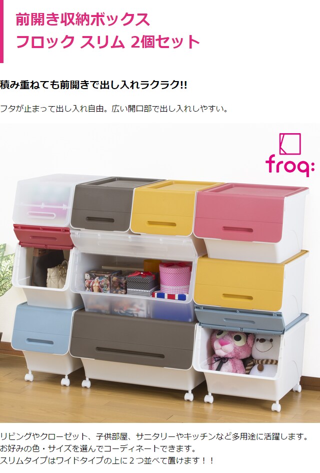 - 【ブルー】日本製前開き収納ボックス スリム フロック 同色2個組