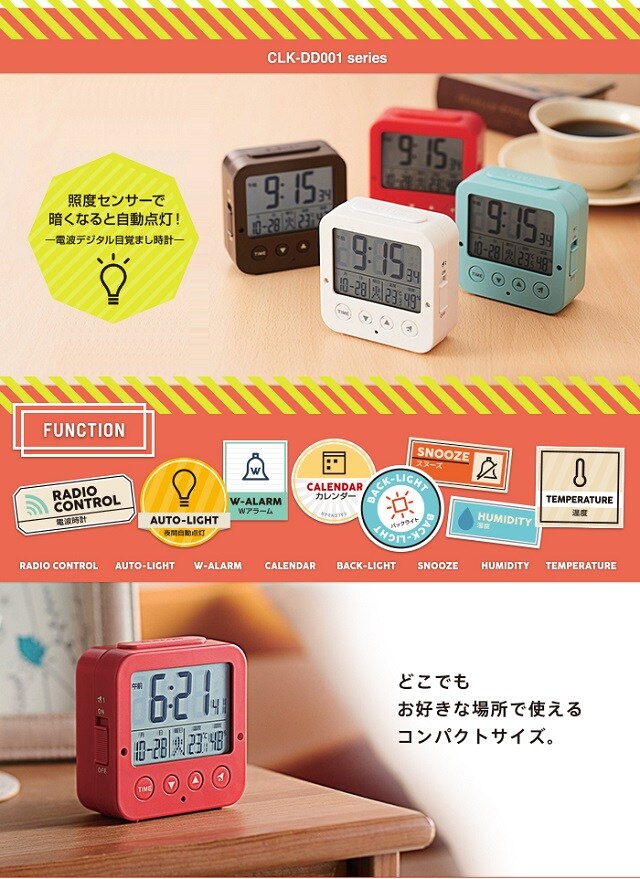 電波デジタル目覚まし時計(CLK-DD001BR) CLK-DD001BR お家で旅行でどこでも使えるコンパクトサイズ。照度センサー付きで暗くなると自動で点灯する、電波デジタル目覚まし時計。