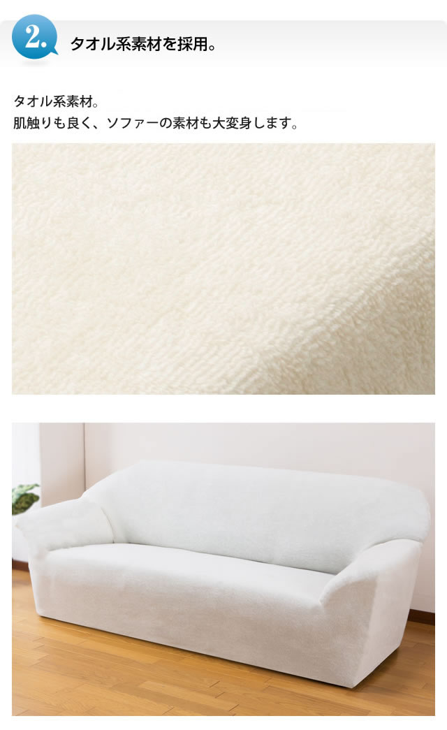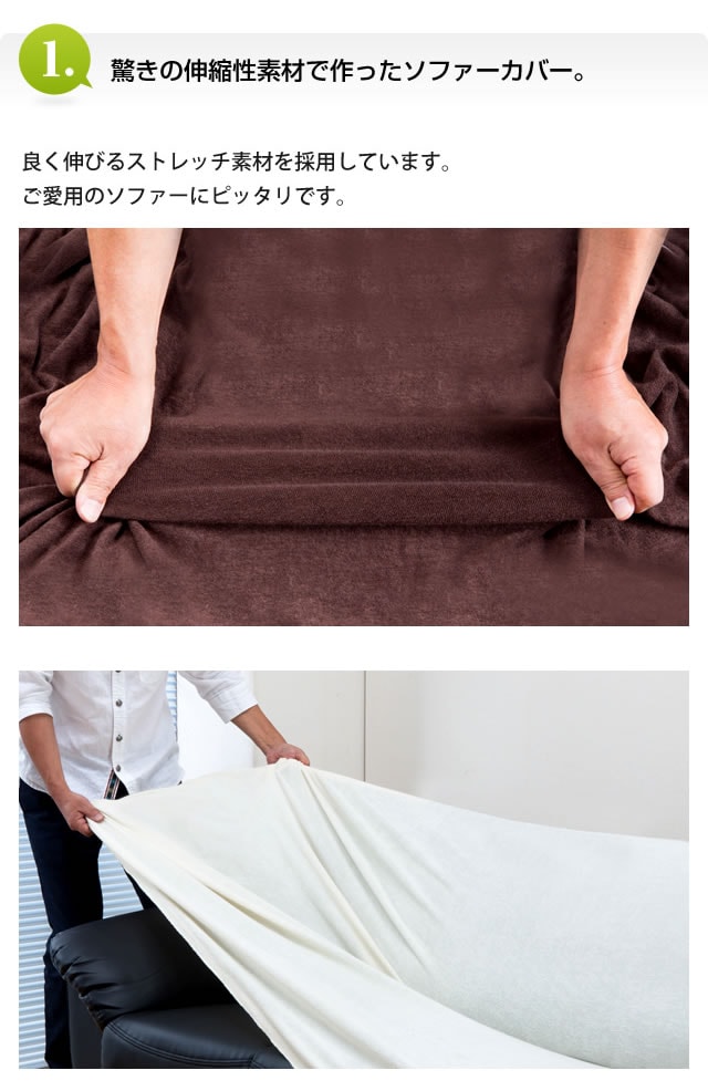 伸縮性のある生地なので、ソファにぴったりフィット。かぶせるだけで新品のソファのように変身。