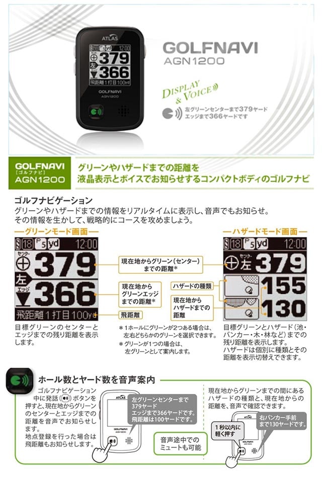 グリーンやハザードまでの情報をリアルタイムに表示し、音声でもお知らせ。ユピテル ゴルフナビ