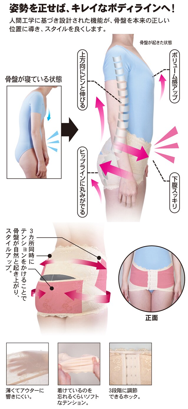 人間工学に基づき設計された機能が、骨盤を本来の正しい位置に導き、スタイルを良くします。