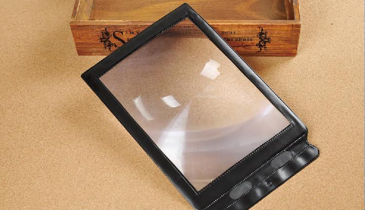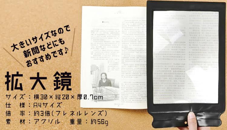 軽く薄い持ち運びに便利な、3倍率のA4サイズ拡大鏡(ルーペ)です。