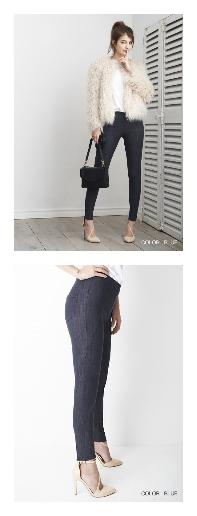 濃紺とブラックで合わせやすいカラー!脚のラインにピタッと沿った立体変形カットが特徴。美脚効果大!のデニムレギンス!!横から見たカットも、デニム美人!