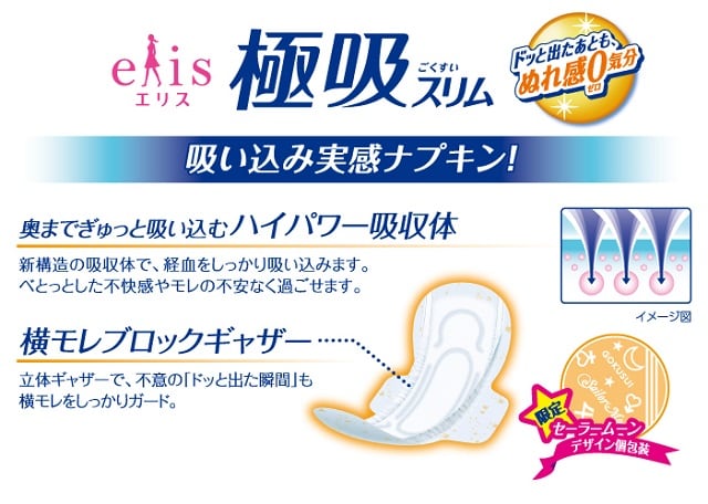 1個299円 吸い込み実感ナプキン! 【セーラームーンデザイン】エリス 極吸スリム(多い日の昼用) 羽つき 21枚×16個