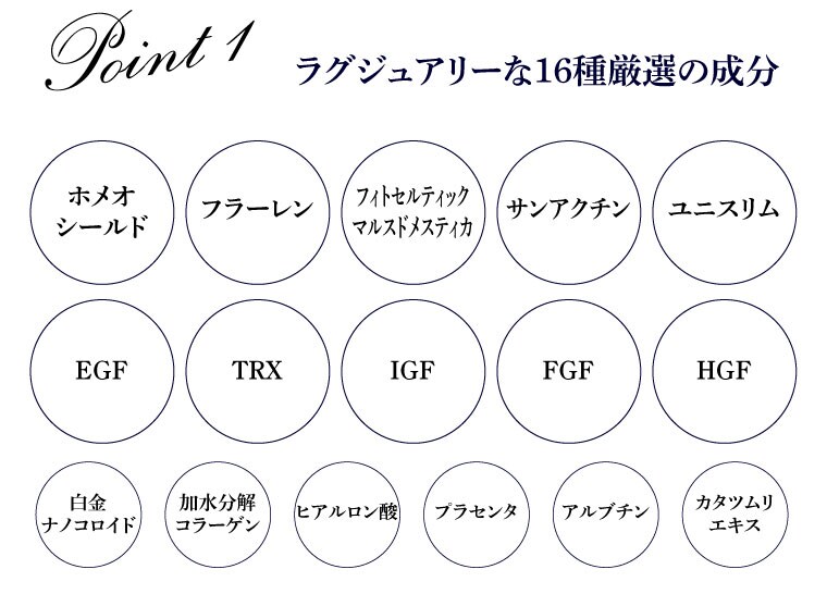 原材料 : 水、DPG、グリセリン、アルギン酸Na、ポリソルベート-80、PCA-Na、ヒアルロン酸Na、アロエベラ葉エキス、加水分解コラーゲン、プラセンタエキス、ポリグルタミン酸、レシチン、ダイズ油、エタノール、リン酸Na、アルブチン、ダイズ種子エキス、白金、ヒトオリゴペプチド-1、フラーレン、PVP、フカスセラツエキス、ヒマワリ芽エキス、マテチャ葉エキス、コーヒー種子エキス、セチルヒドロキシエチルセルロース、PEG-60アーモンド脂肪酸グリセリル、オリゴペプチド-20、リンゴ果実培養細胞エキス、キサンタンガム、トコフェノール、デキストラン、カプロオイルテトラペプチド-3、アセチルデカペプチド-3、ヒトオリゴペプチド-4、カタツムリ分泌液、メチルパラベン、フェノキシエタノール