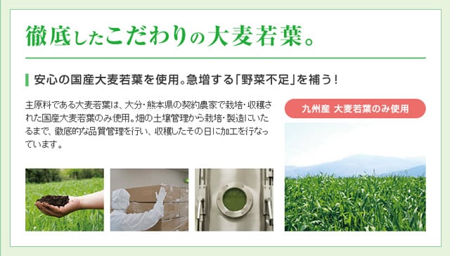 主原料である大麦若葉は、大分・熊本県の契約農家で栽培・収穫された国産大麦若葉のみ使用。畑の土壌管理から栽培・製造にいたるまで、徹底的な品質管理を行い、収穫したその日に加工を行なっています。