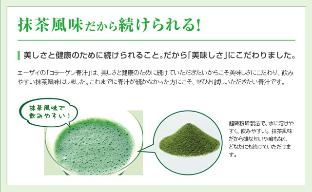 エーザイの「コラーゲン青汁」は、美しさと健康のために続けていただきたいからこそ美味しさにこだわり、飲みやすい抹茶風味にしました。これまでに青汁が続かなかった方にこそ、ぜひお試しいただきたい青汁です。