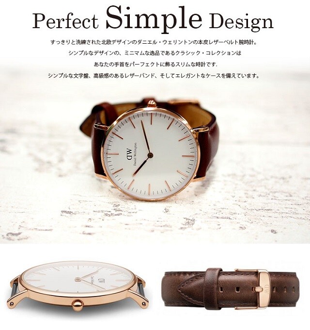 洗練された北欧デザインで話題のダニエル・ウェリントンの本革レザーベルトの腕時計。