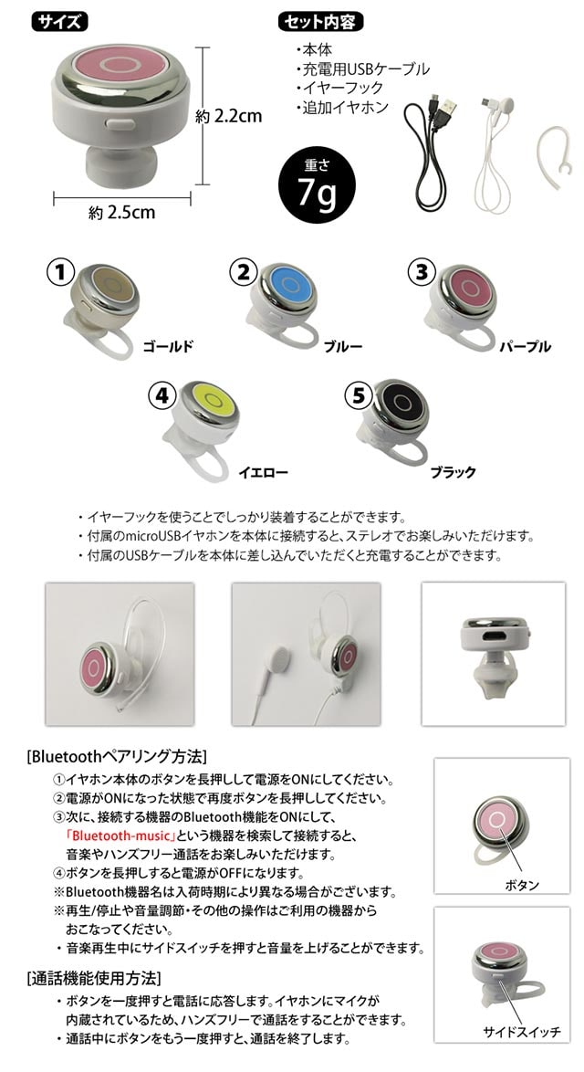 セット内容:本体、充電用USBケーブル、イヤーフック、イヤホン