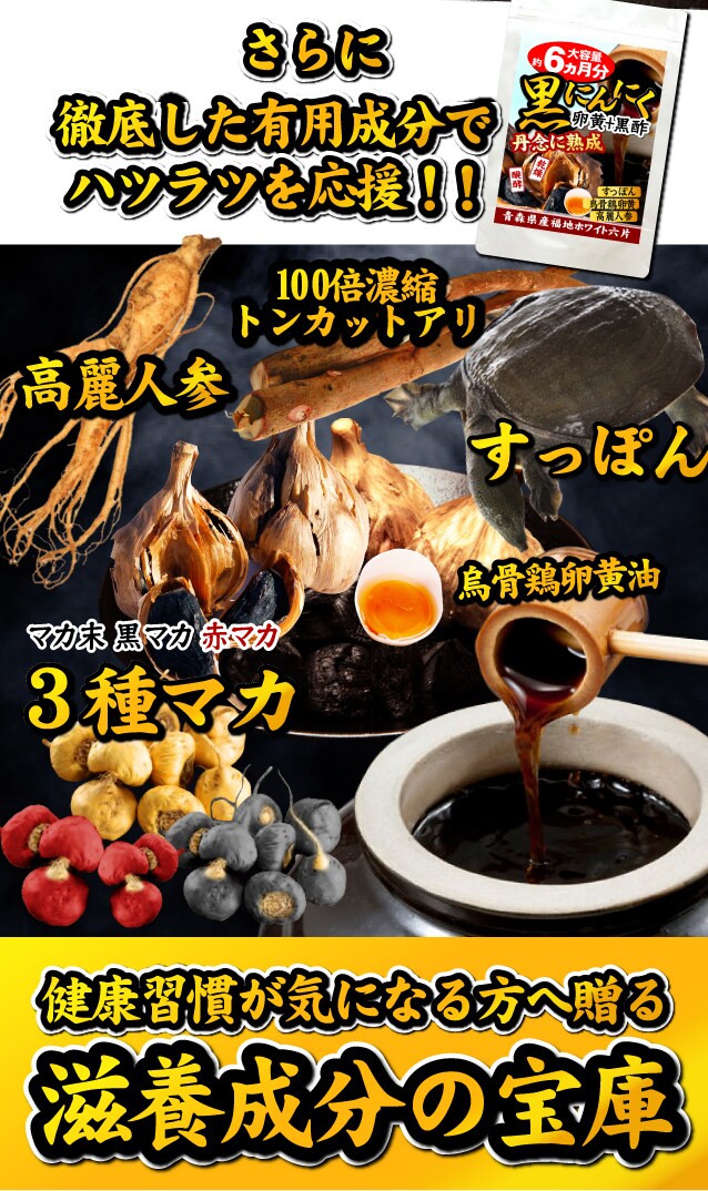 原材料 : 醗酵黒ニンニク末、烏骨鶏卵黄油、黒酢もろみ末、トンカットアリエキス、赤マカエキス末、高麗人参末、亜鉛含有酵母、スッポン末、植物発酵エキス、マカ末、黒マカ末、米酢粉末、セルロース、クエン酸、ステアリン酸カルシウム、微粒酸化ケイ素、L-アルギニン、ビタミンC、ビタミンE、ナイアシン、パントテン酸Ca、ビタミンB2、ビタミンB1、ビタミンB6、ビタミンA、葉酸、ビタミンD、ビタミンB12