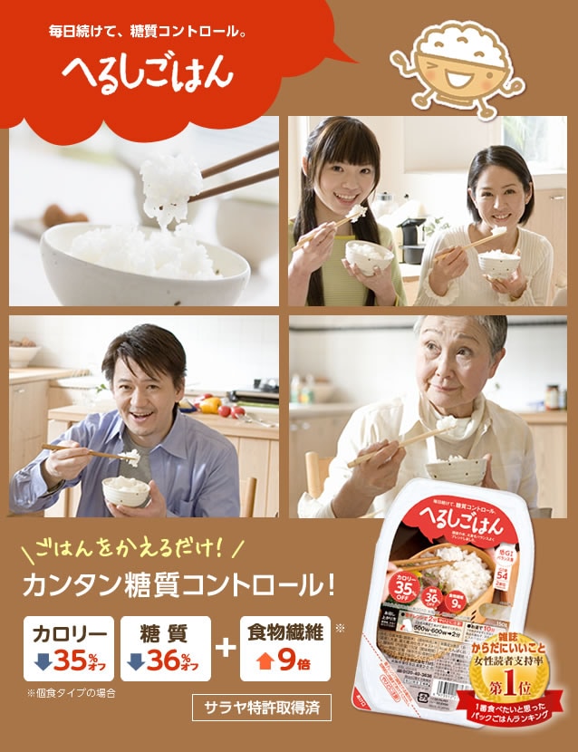 白いごはんが大好き!でもダイエット中だから控えないと・・・、とお考えの方にオススメなのが「へるしごはん」。パック米なので、簡単に調理できるのも嬉しいポイント。いつものごはんを「へるしごはん」にかえて、毎日の健康生活にお役立てくださいませ。