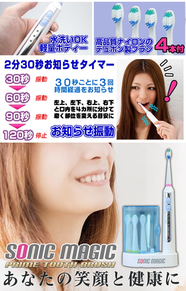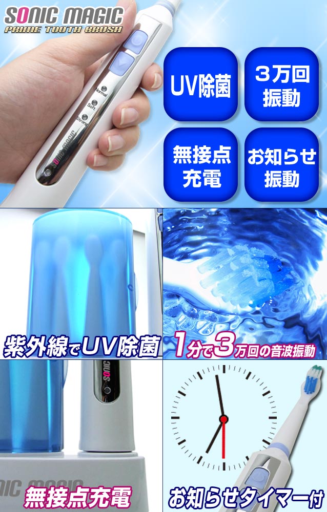 ソニックマジック | 毎分3万回の音波振動★UV除菌器&専用ブラシ4本付き音波電動歯ブラシ