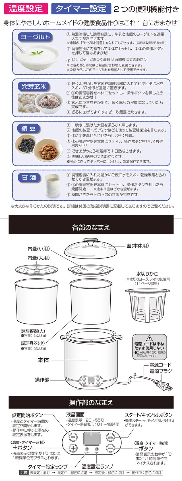 温度設定とタイマー機能搭載で、ヨーグルト・納豆・甘酒を簡単に作ることが出来る調理家電です。