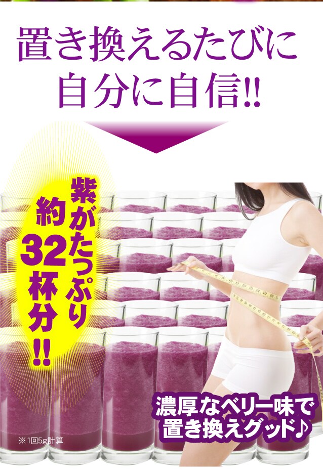 欲張り満載アサイーダイエットスムージー。紫がたっぷり約32杯分(※1回5g換算)もはいってるから置き換え放題。