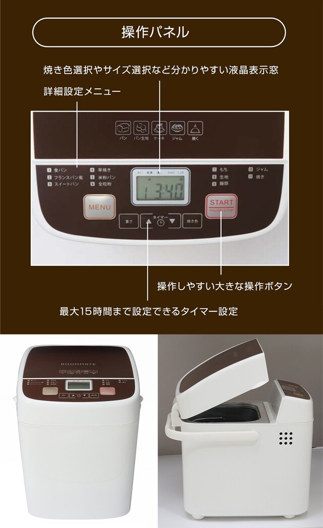 ・最大15時間まで設定できるタイマー:タイマー機能を利用し、夜に材料をセットして置けば翌朝に焼きたてパンが食べられます。