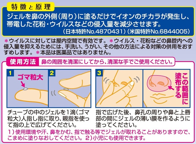 鼻の周りにプラスイオンの見えない透明な膜を作り、花粉・ウイルスなどの鼻腔内への侵入を減少させます。