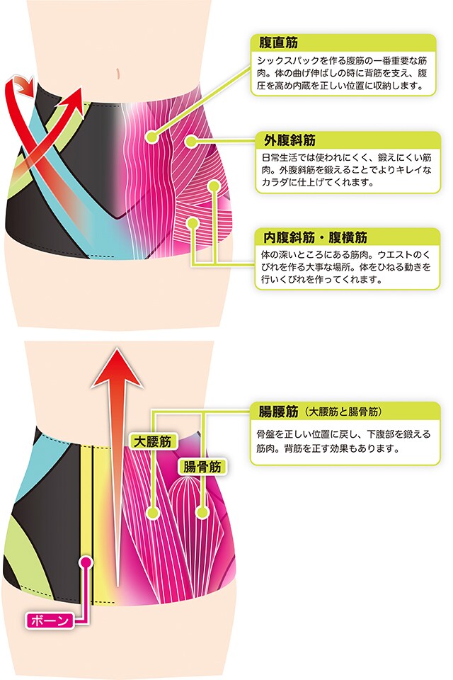 ・ポイントは素材の特殊な凸凹加工。絶妙な圧力と生地の凸凹刺激で、腹筋にぐいぐいアプローチ。特にウエストを締めるのに必要なタテの腹直筋やクビレを作る斜めの外腹斜筋、凹腹の要の腹横筋や内腹筋を3方向からギューギュー!これらの筋肉は奥にあり、普通に腹筋しただけでは動かしにくいんです。それを効率よくグイグイしてくれるからキク!