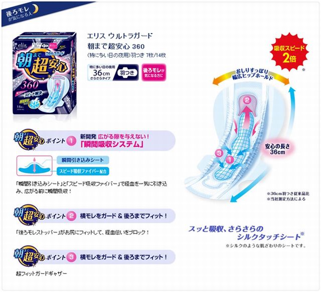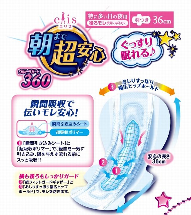 エリス 朝まで超安心 360(特に多い日の夜用) 羽つき 14枚×16個 | 量が多くても安心吸収の夜用タイプ