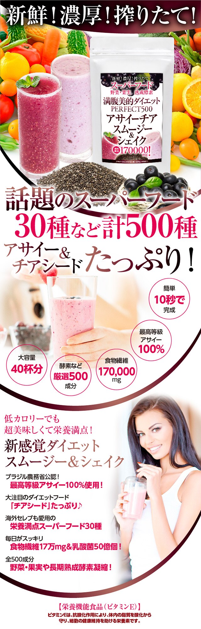 満腹美的ダイエットPERFECT500 アサイーチアスムージー&シェイク 食物繊維170000mg 240g(40杯分) | 超栄養満点の極旨酵素スムージーシェイク◎