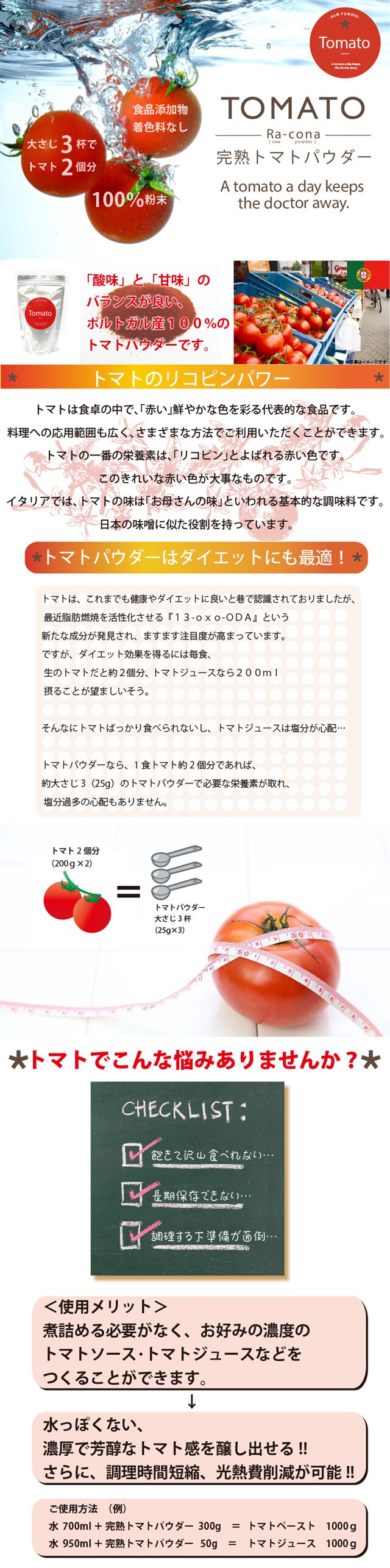 ●本品はポルトガル産の完熟トマトをまるごと乾燥粉末にしたものです。