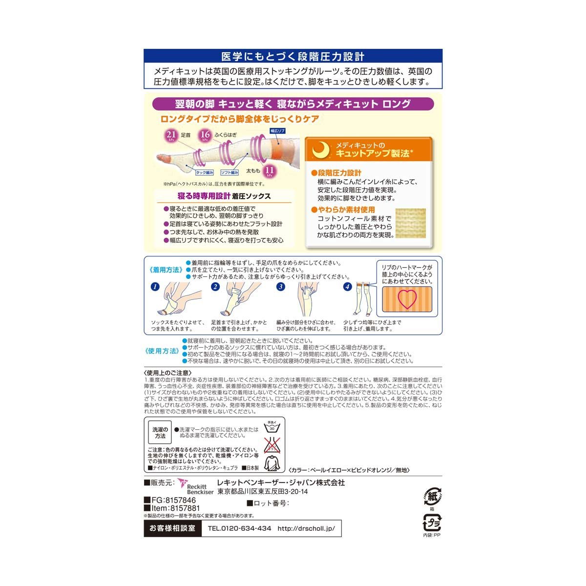 ※医学にもとづく段階圧力設計・・・メディキュットは英国の医療用ストッキングがルーツ。その圧力数値は、英国の圧力値標準規格をもとに設定。はくだけで、脚をキュッとひきしめます。