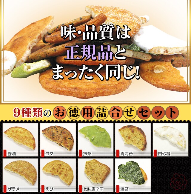 ・9種類(醤油・青海苔・胡麻・海苔・ザラメ・抹茶・えび・白砂糖・七味唐辛子)のセットでお届け!!