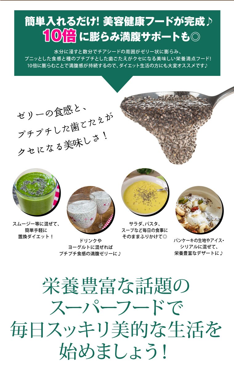 スーパー満腹ダイエットフード チアシード100% 500g | 奇跡のダイエットフード 10倍膨張で満腹感が持続!いつもの食事に混ぜるだけ♪スプーン1杯の美的生活