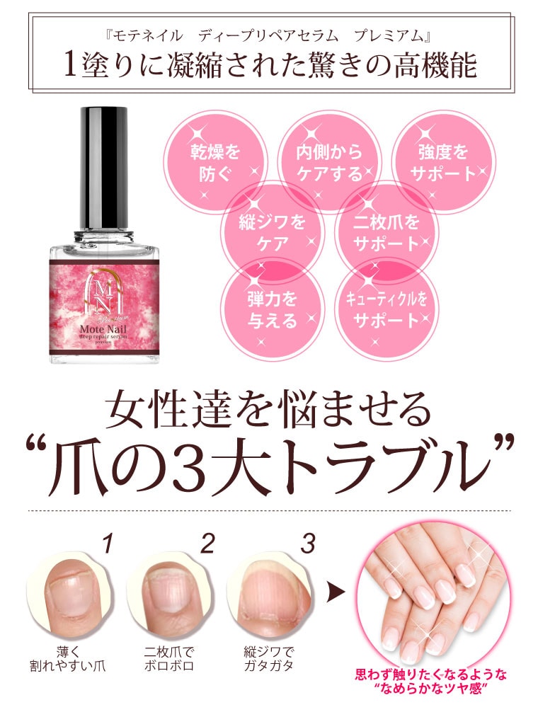 モテネイルプレミアム | 大人気のモテネイルがさらに進化!たった1塗で先端成分50種が傷みやすい爪に浸透“たっぷり潤い&なめらかな美爪へ”自宅で高級サロン級ケア