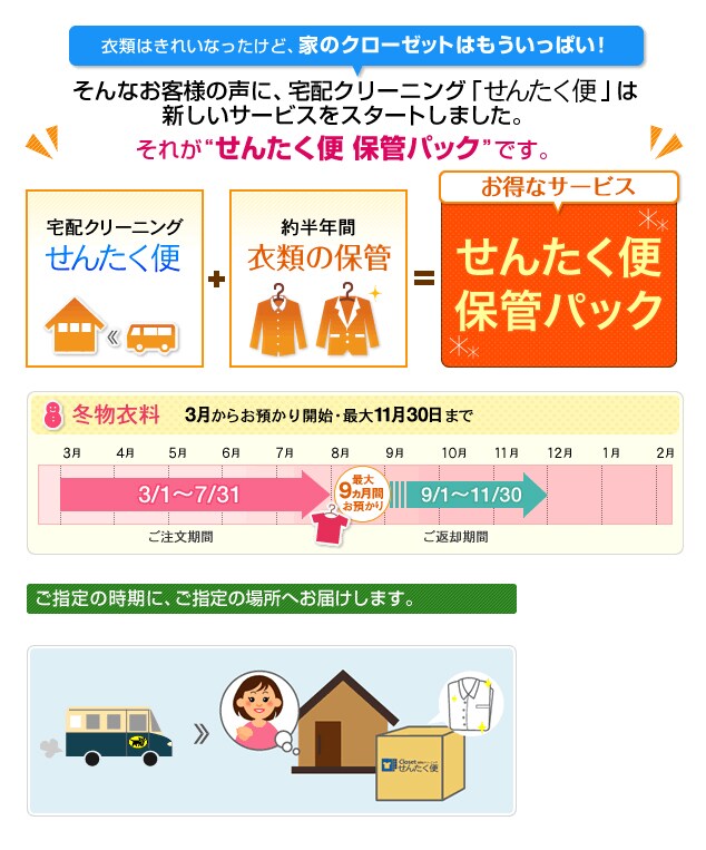 一般的に衣替えのシーズンといわれる(繁忙期)と、そうでない時期(閑散期)ではお預かりする衣類の数も半分ほどになり、お店のラックにも余裕が出ます。その空いたラックに、お客様の衣類を最大9ヶ月間お預かりするサービスが、この「せんたく便保管パック」です。「送料無料」「保管料無料」「しみ抜き無料」で受付させて頂き、お客様が気軽にサービスをご利用できるようにしました。