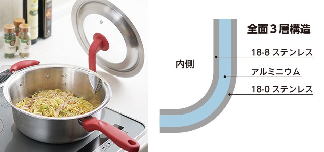 熱が伝わりやすいアルミニウムを、内外面とも丈夫なステンレスで挟んだ「全面3層構造」。底面からの熱を側面にも素早く伝え、加熱時間を短縮し熱エネルギーを節約します。